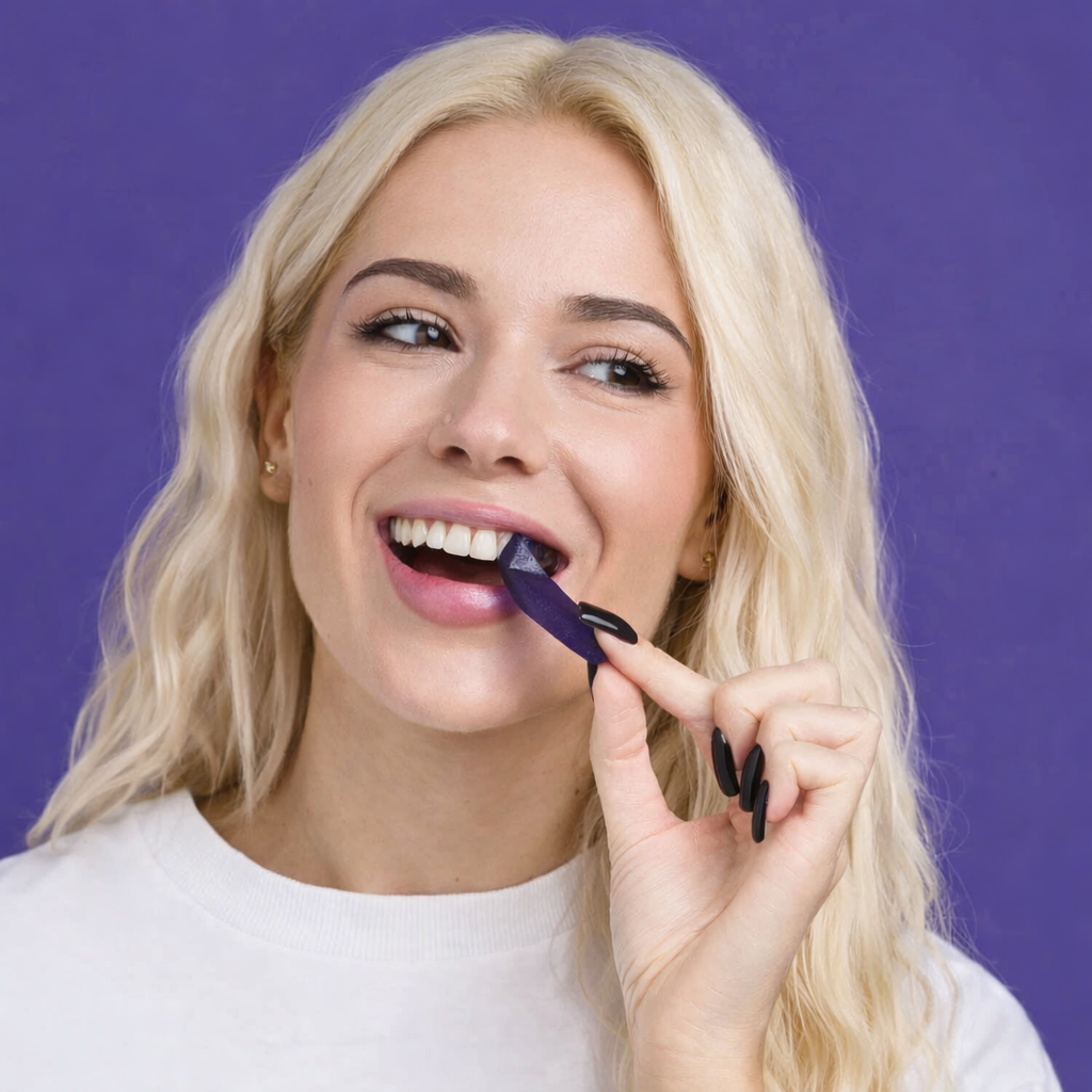C'est le secret de la colorimétrie appliqué au sourire. Tout comme le shampoing violet déjaunit les cheveux blonds, nos bandes utilisent des pigments violets pour annuler optiquement les tons jaunes de l'émail. C'est une astuce visuelle puissante qui donne l'apparence d'un sourire plus blanc instantanément.